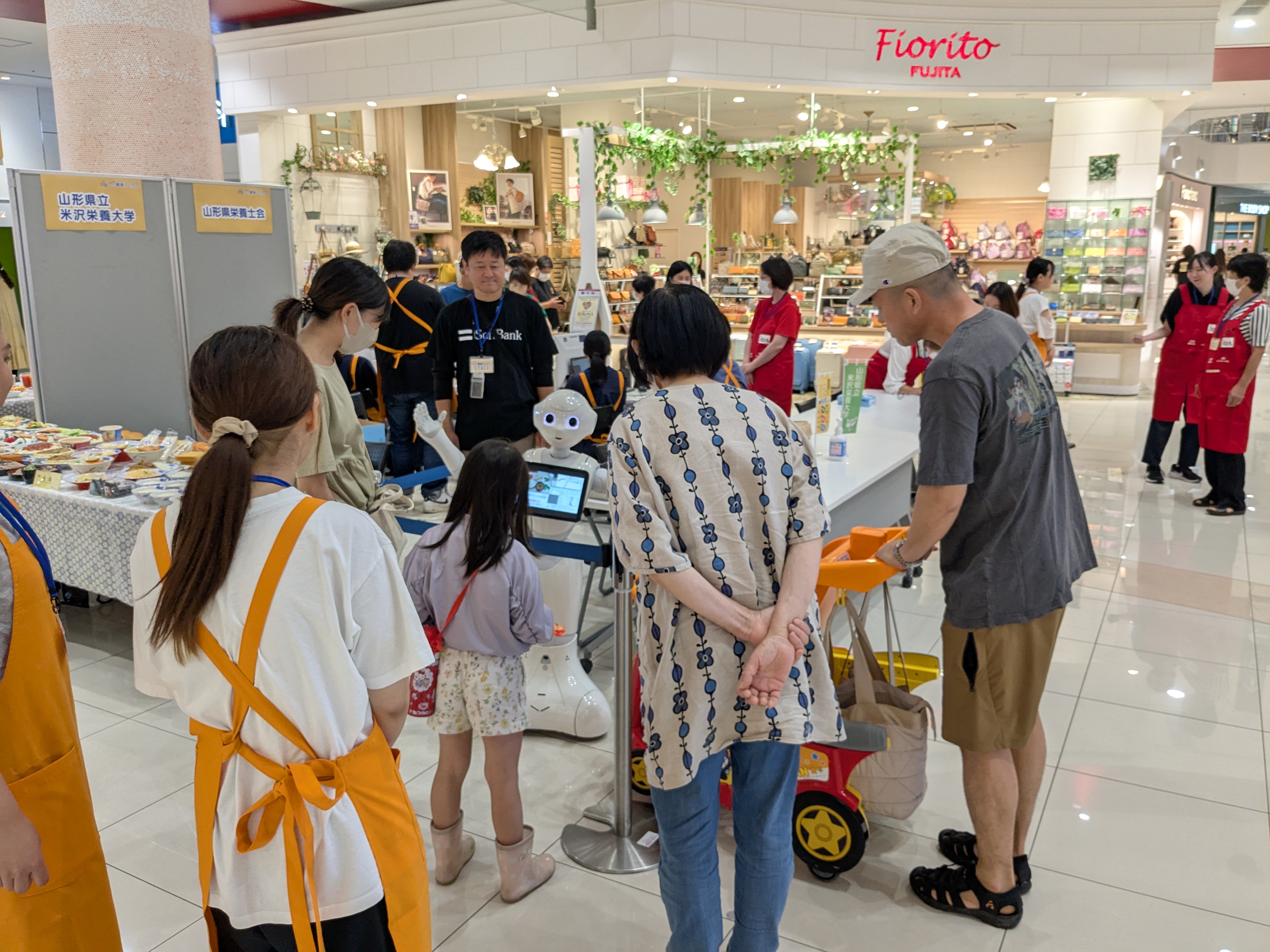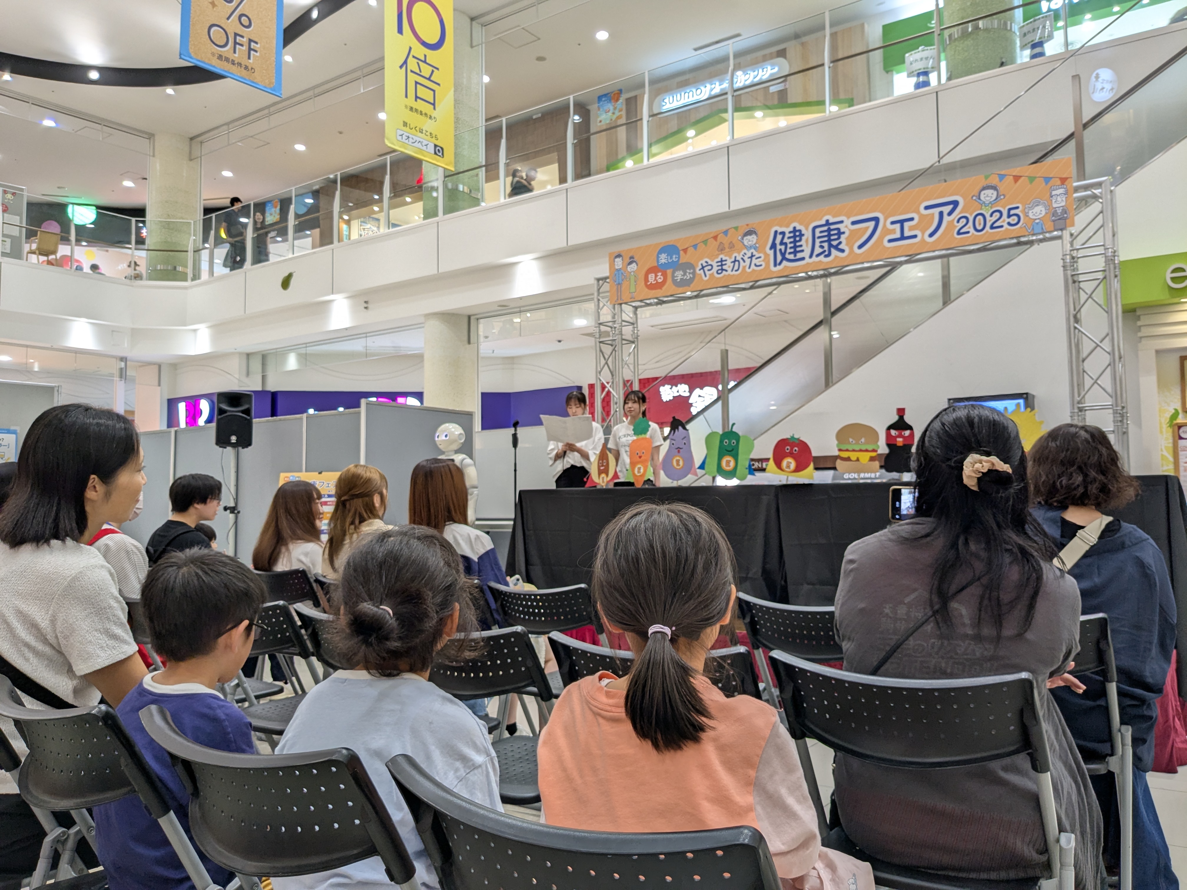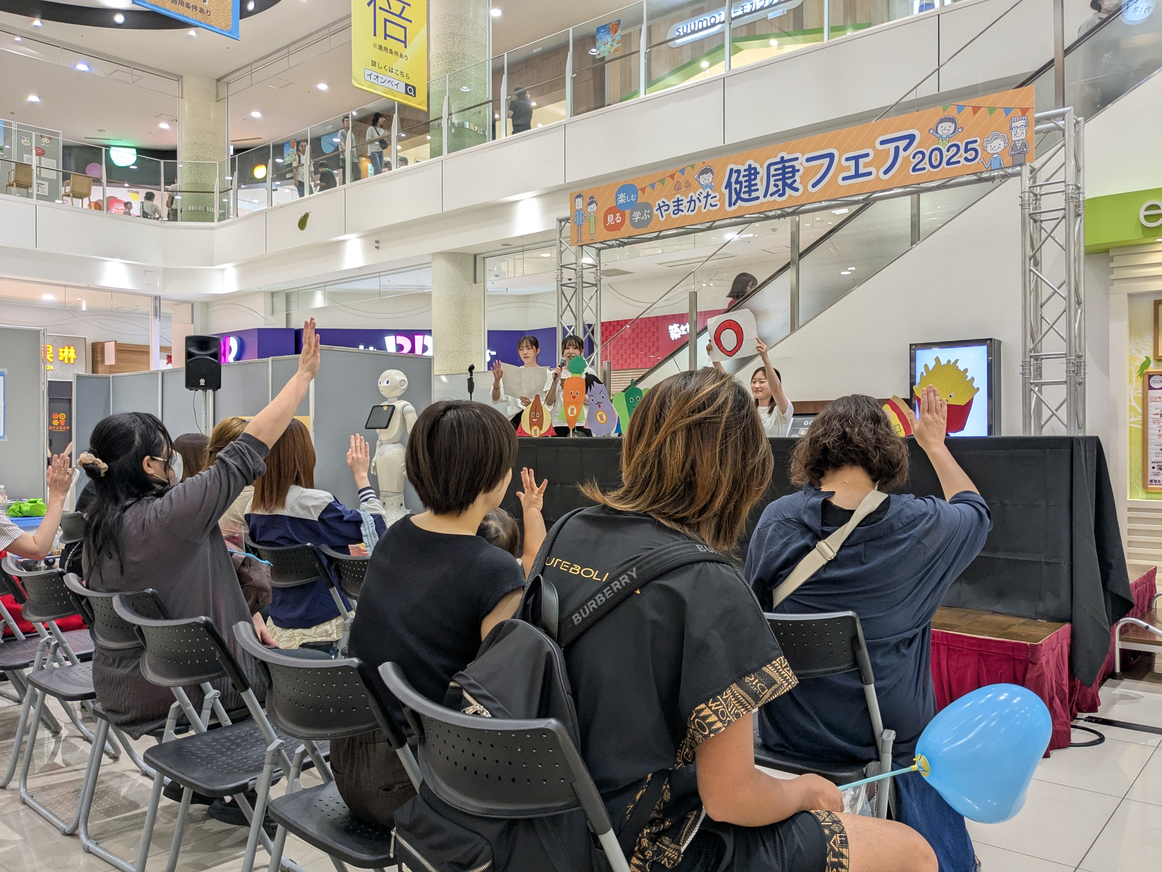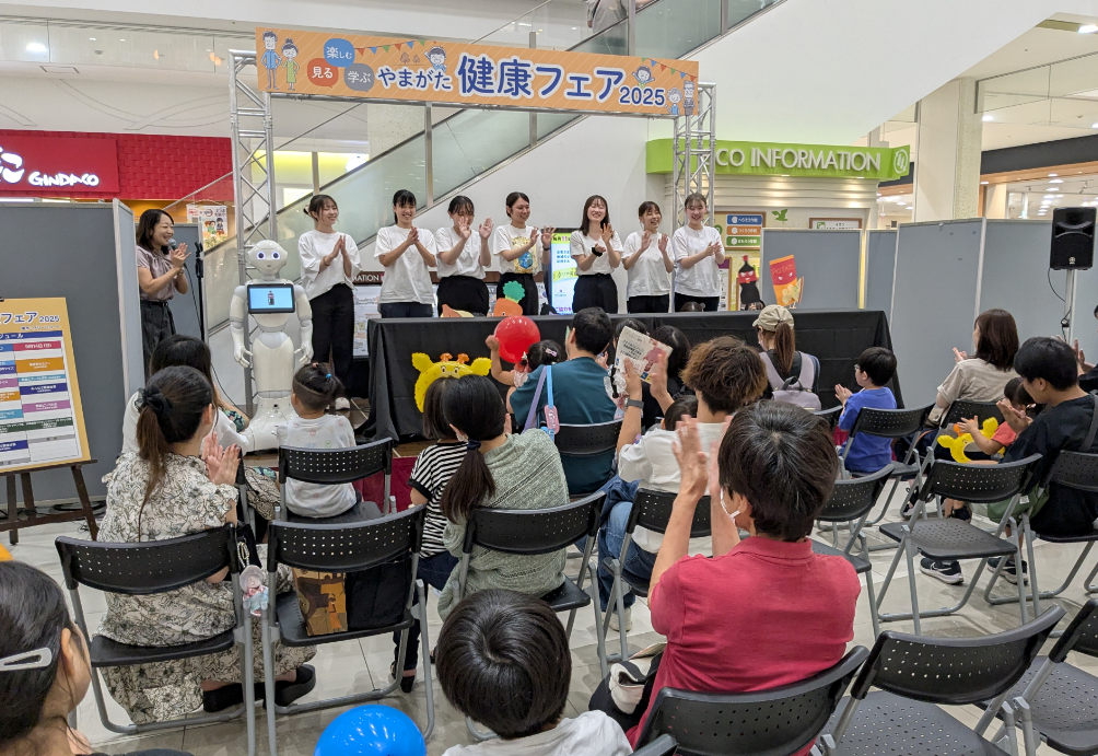 令和7年9月13日(土)と14日(日)の2日間にわたってイオンモール天童で開催された「やまがた健康フェア2025」に、本学の学生がソフトバンクの人型ロボットPepperと一緒に参加しました!