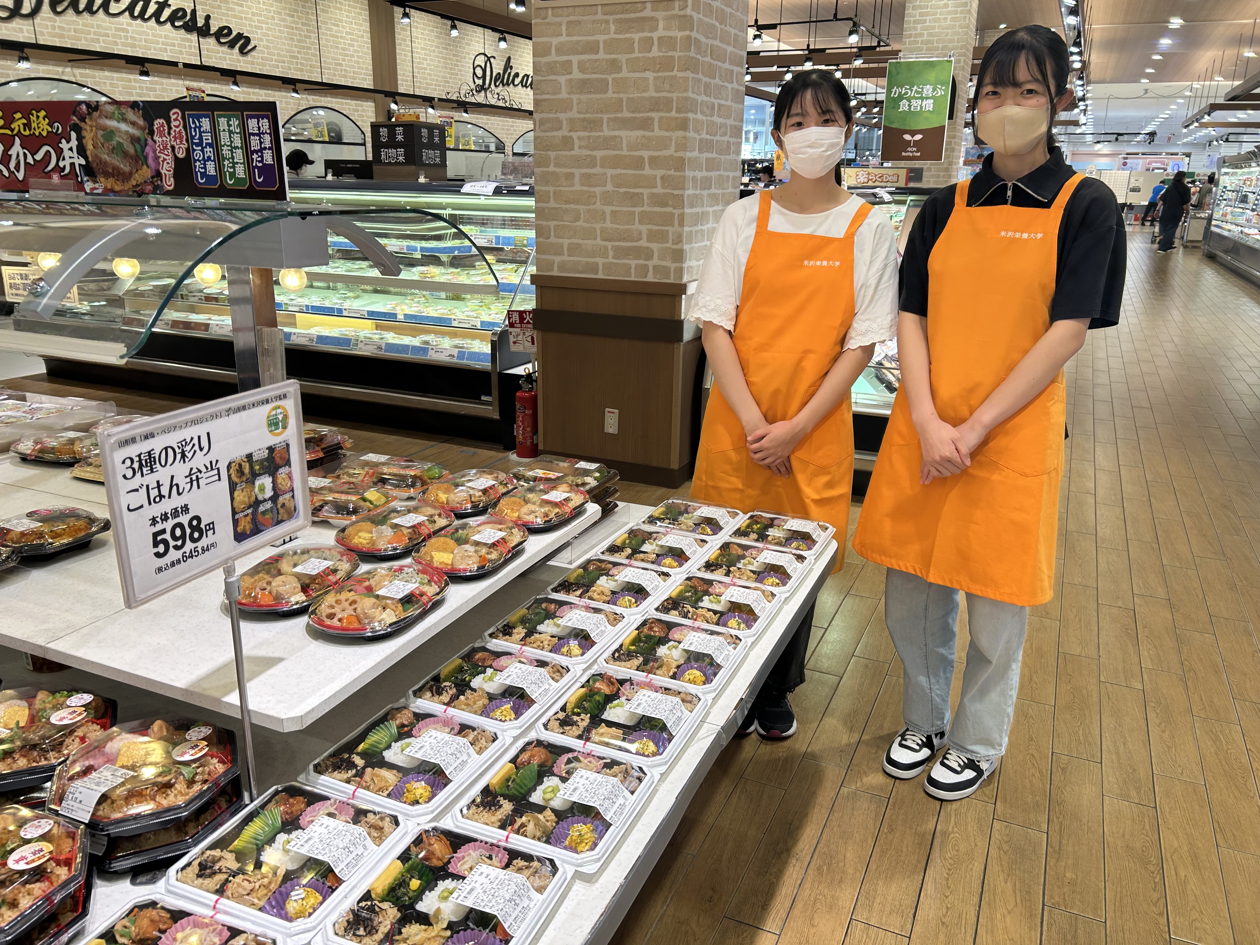 あわせて、山形県「減塩・べジアッププロジェクト」の一環として、イオン東北株式会社様と連携して本学の学生が考案したお弁当の販売があり、学生が参加して店頭販売を行いました。